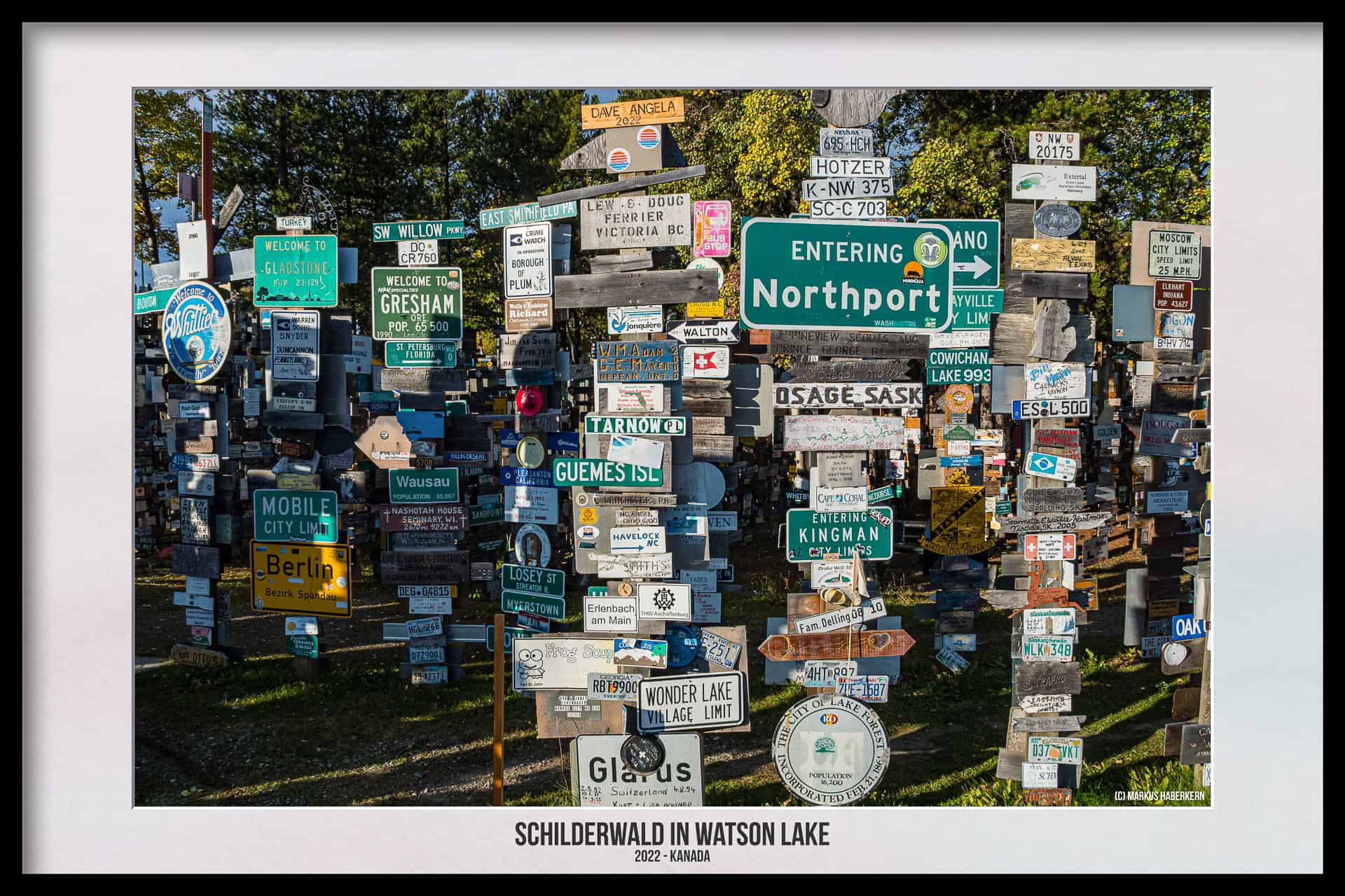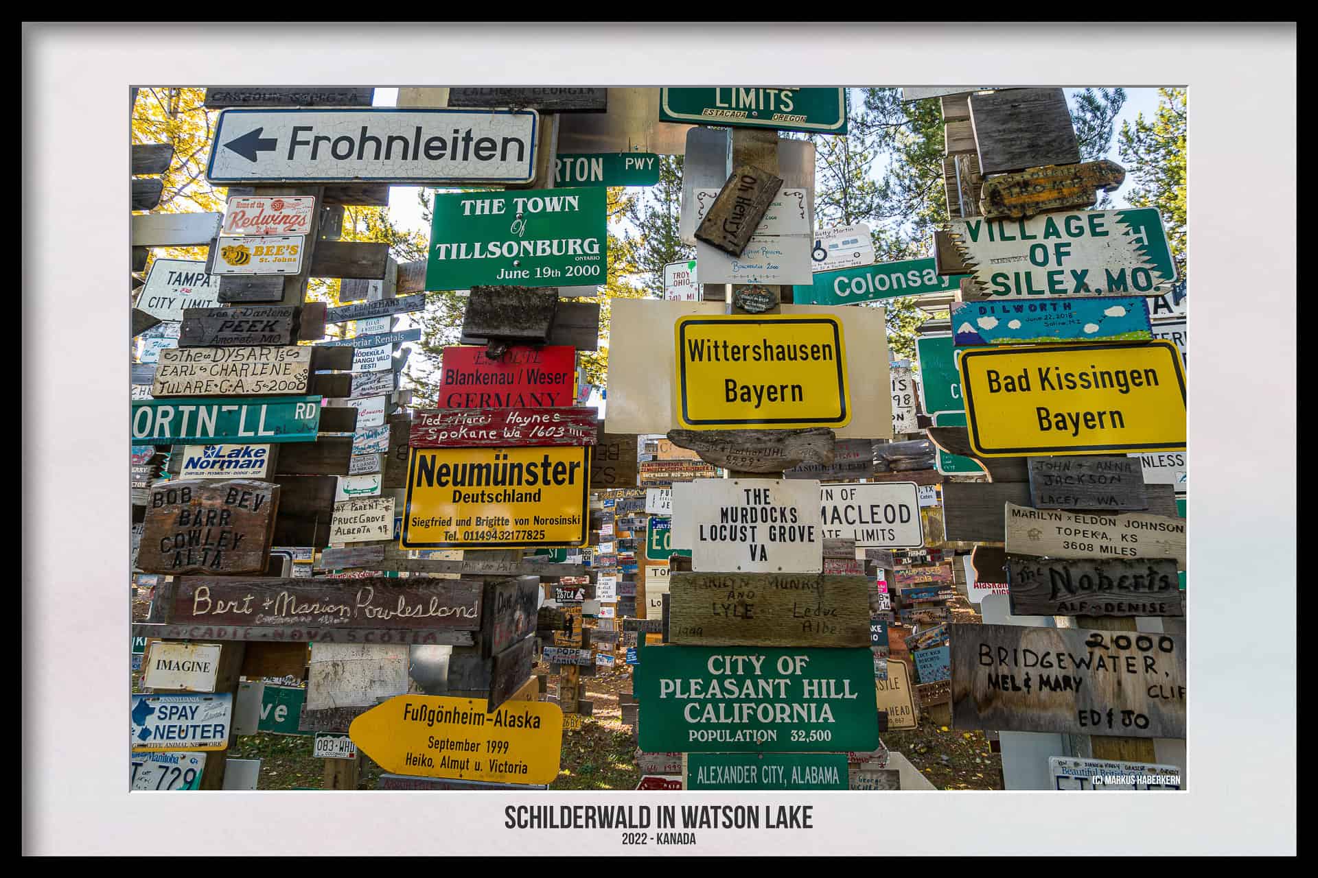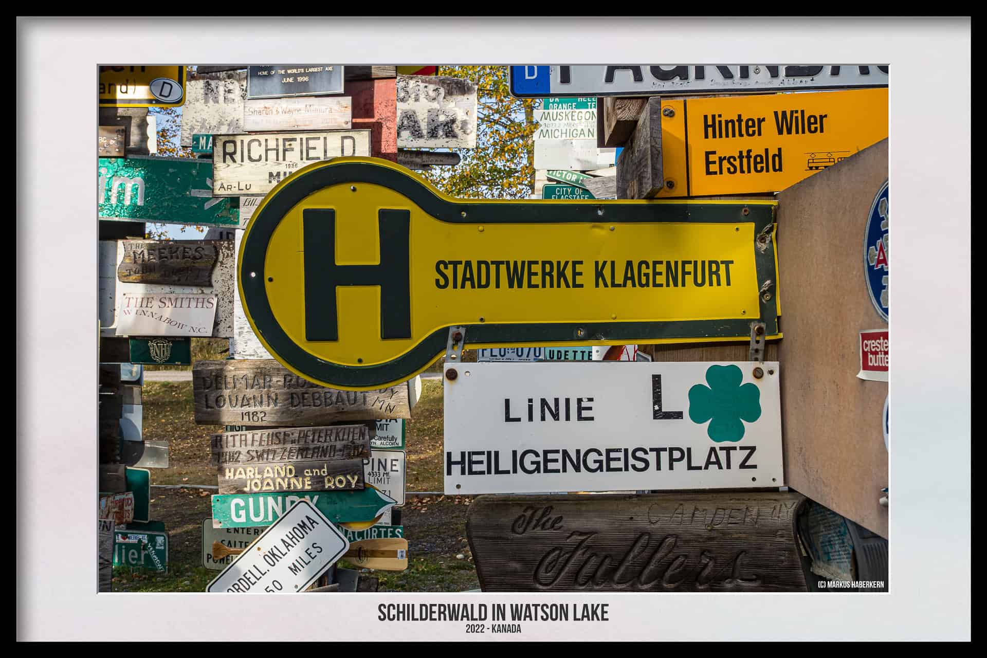 Wo München und Berlin in Kanada liegen und der Bus zu den Stadtwerken Klagenfurt hält. Watson Lake, eine eigentlich verschlafene Kleinstadt mit gerade einmal 800 Einwohnern am südlichen Ende des Yukon Territories, wird für viele Kanada Touristen oft für kurze Zeit eine Touristenattraktion. Das liegt weniger an dem Ort selbst, der eigentlich bis auf wenige Einkaufsmöglichkeiten nichts Besonderes bietet, sondern an dem sogenannten Sign Post Forrest, also dem Schilderwald oder auch Wegweiserwald.