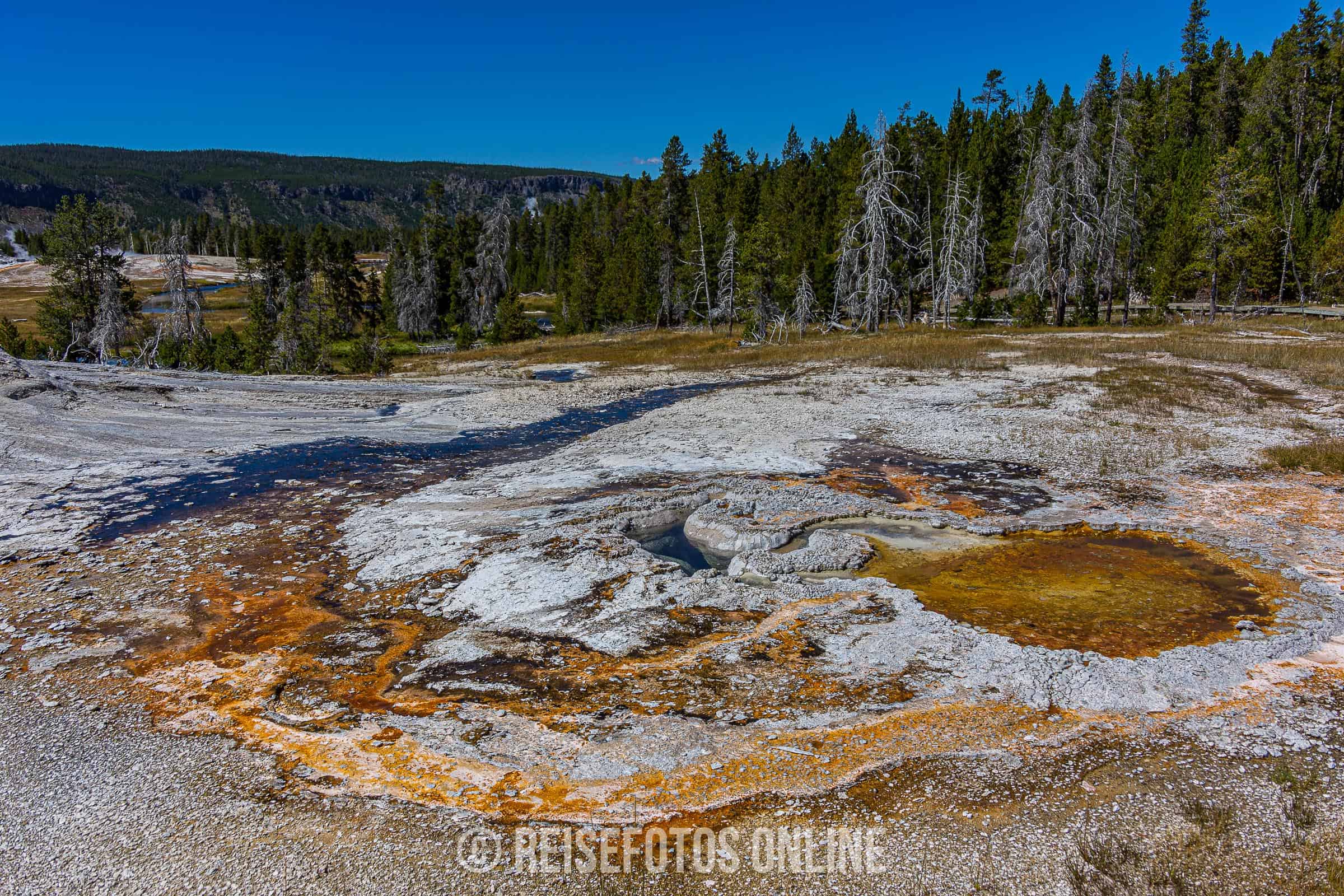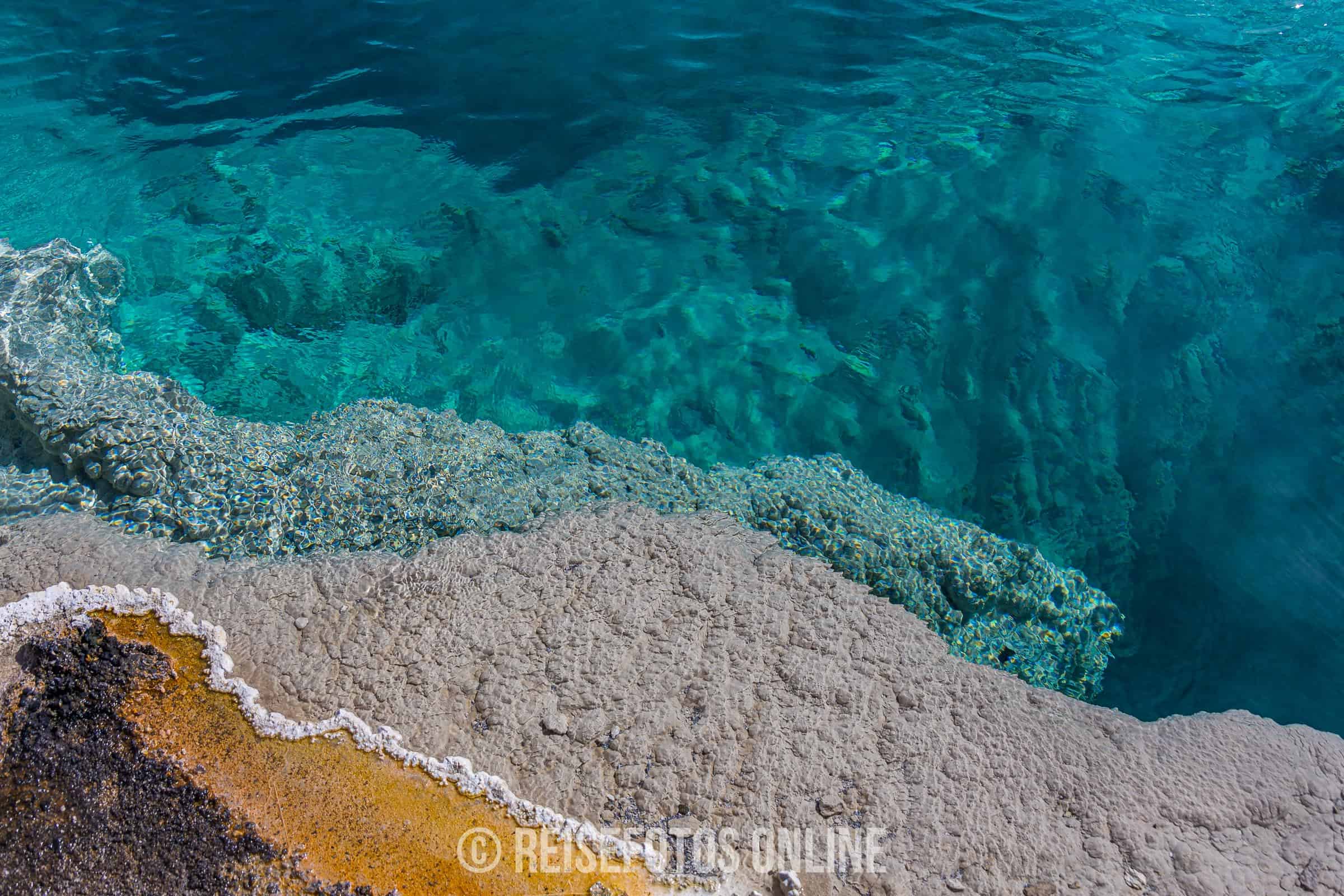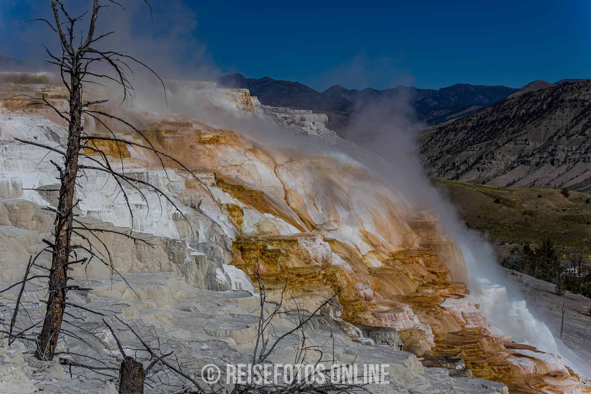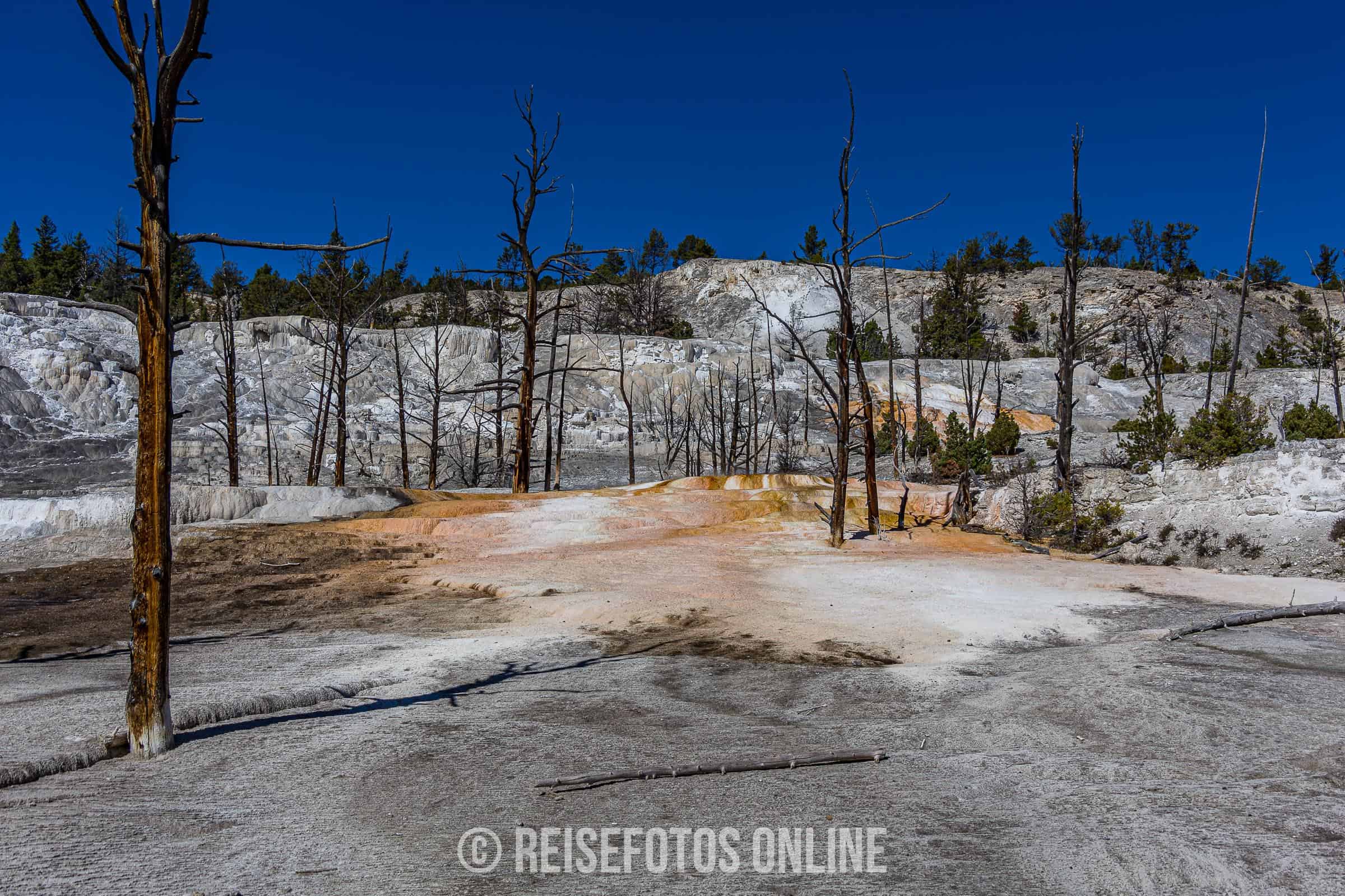 - Mammoth Hot Springs ist eine Gegend aus Sinterterrassen und heißen Quellen. Von den heißen Quellen fließt warmes, sehr kalk- und mineralhaltiges Wasser über die Terrassen und lagert sich in großen Mengen ab. Aufgrund der wechselnden Temperatur und des Mineralgehalts verändern sich die Farben. Es gibt Stellen mit viel weißen Terrassen, aber auch andere Teile mit gelb, orange oder roten Teilen. In der Gegend halten sich meist größere Herden von Wapities auf und wärmen sich auf den warmen Sinterterrassen.
