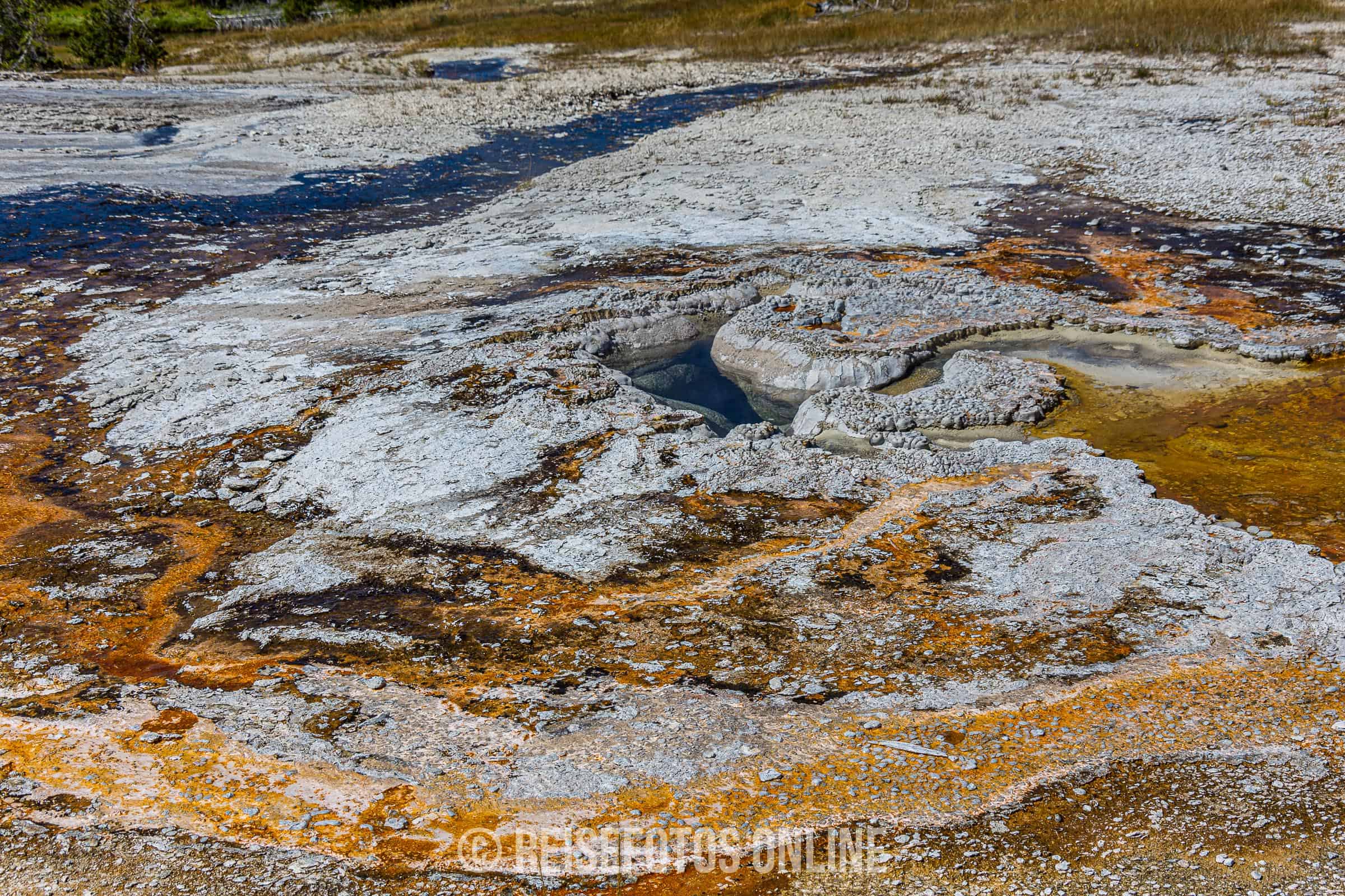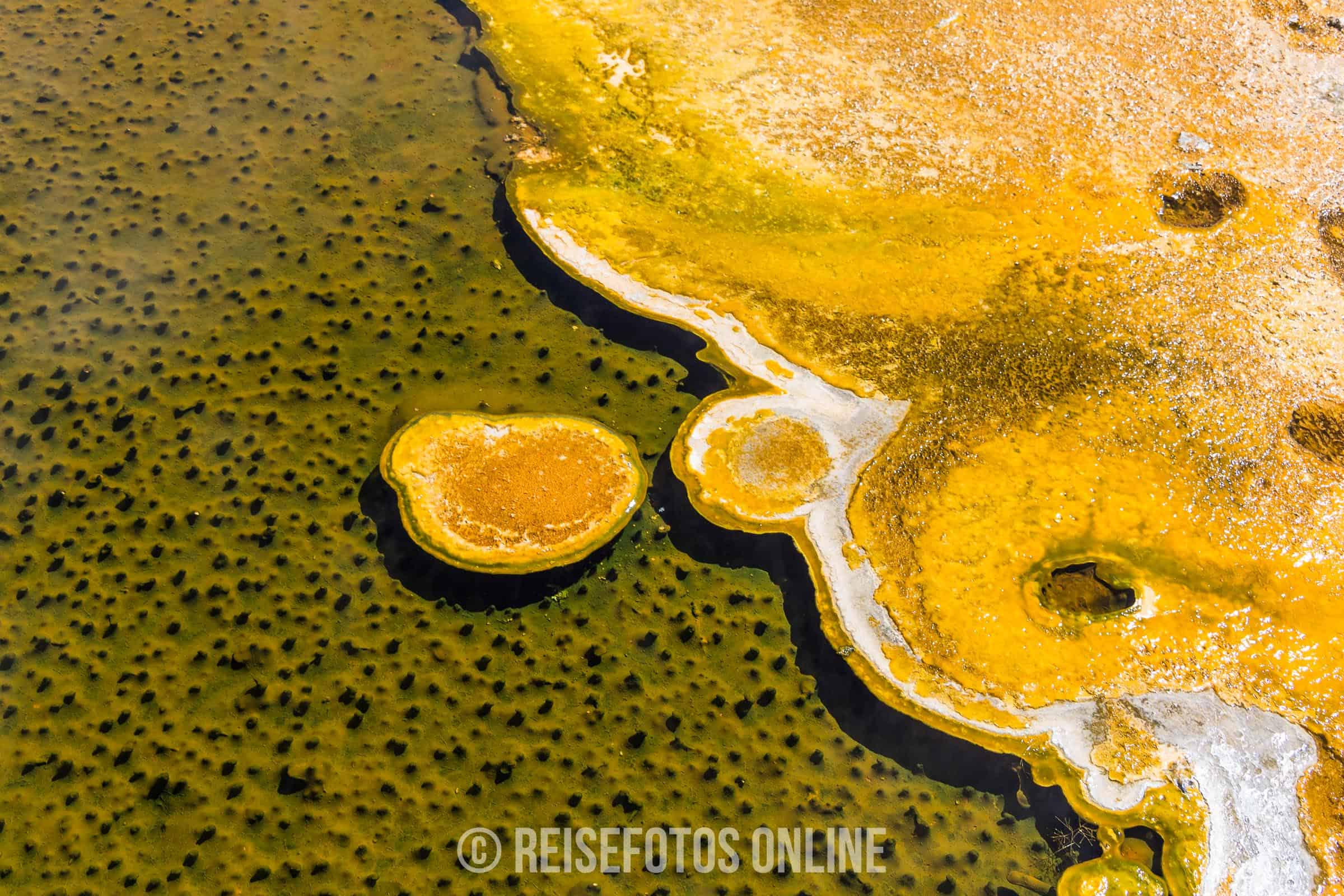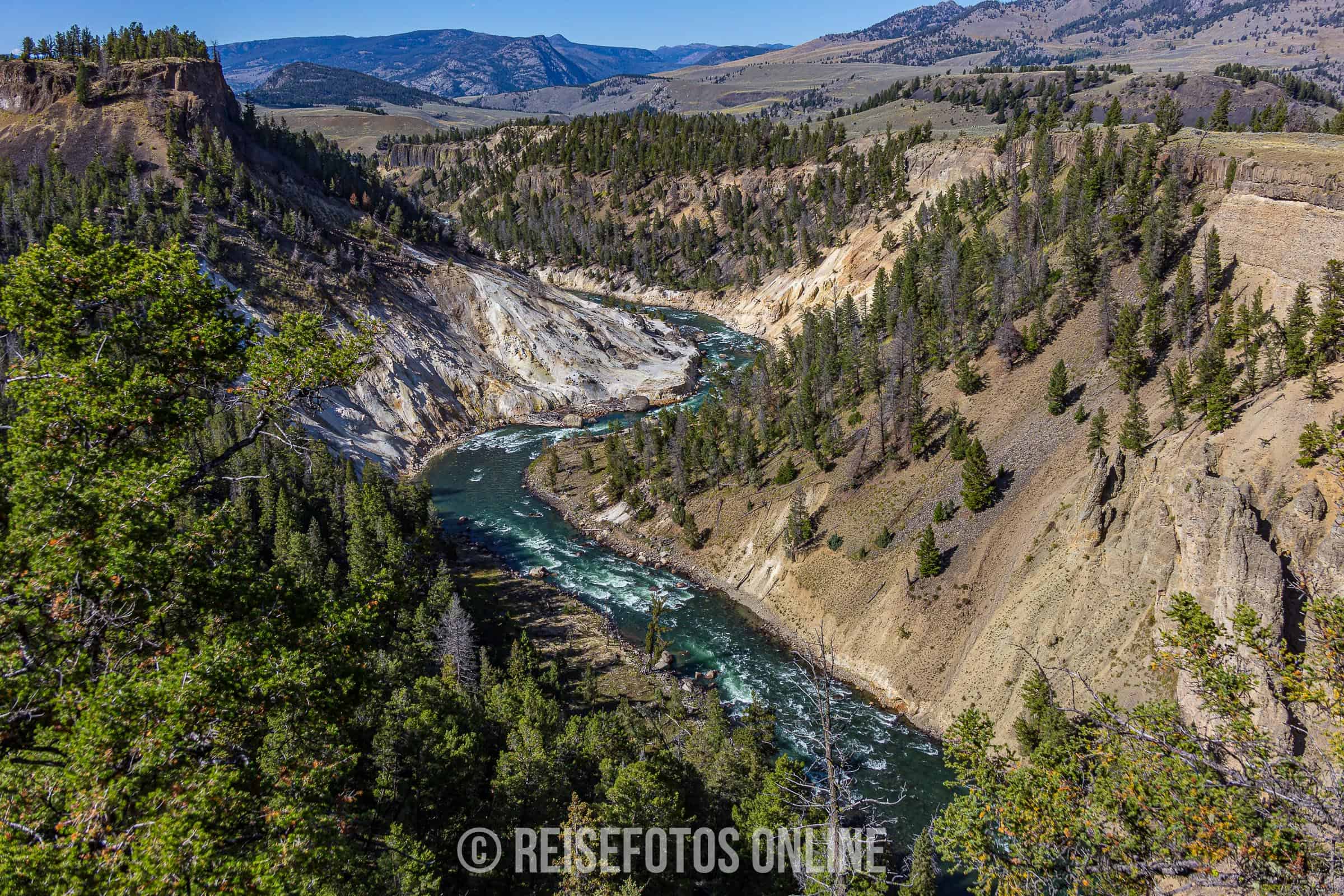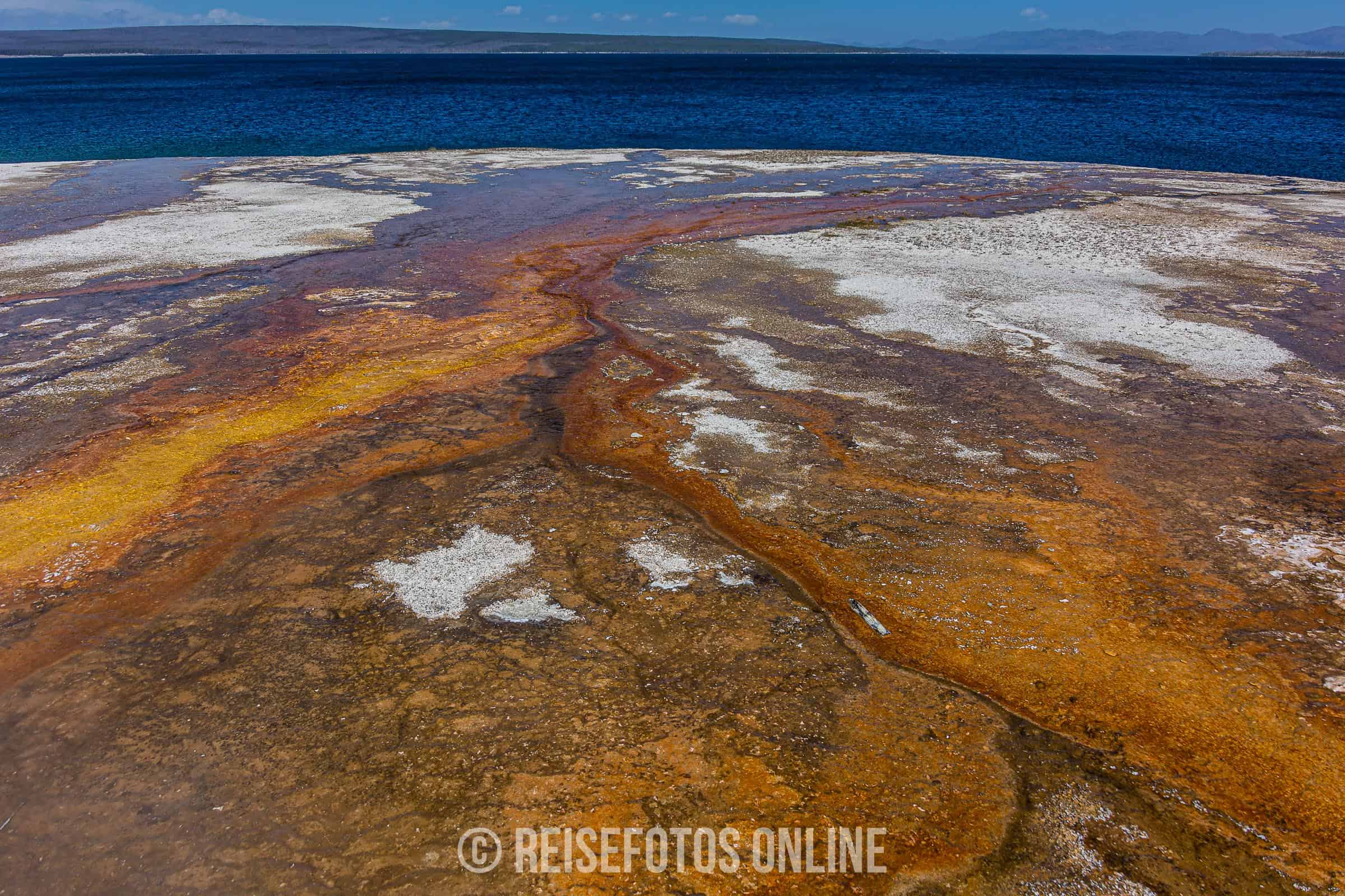 - Mammoth Hot Springs ist eine Gegend aus Sinterterrassen und heißen Quellen. Von den heißen Quellen fließt warmes, sehr kalk- und mineralhaltiges Wasser über die Terrassen und lagert sich in großen Mengen ab. Aufgrund der wechselnden Temperatur und des Mineralgehalts verändern sich die Farben. Es gibt Stellen mit viel weißen Terrassen, aber auch andere Teile mit gelb, orange oder roten Teilen. In der Gegend halten sich meist größere Herden von Wapities auf und wärmen sich auf den warmen Sinterterrassen.